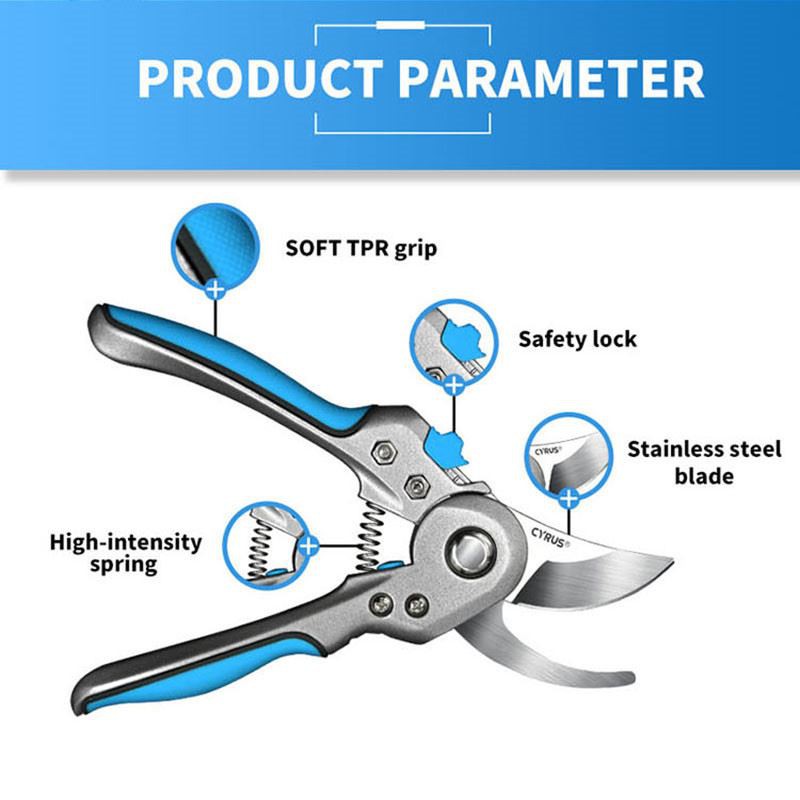 Ryðfrítt stál Pruners er sjálfstæð hönnun okkar á hágæða pruner, notkun á hágæða ryðfríu stáli blað, og með nákvæmni bitskurðarradían, með léttsteyptu álhandfangi sem aðalhandfangi og húðvænt mjúkt TPR umbúðalím í snertingu við höndina staður.